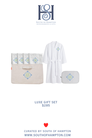 Elevated, timeless, and beautifully personalized ✨ Our Luxe Gift Set includes a monogrammed waffle robe, coordinating pouch, plush embroidered towels, and a custom canvas tote — thoughtfully curated for unforgettable gifting.