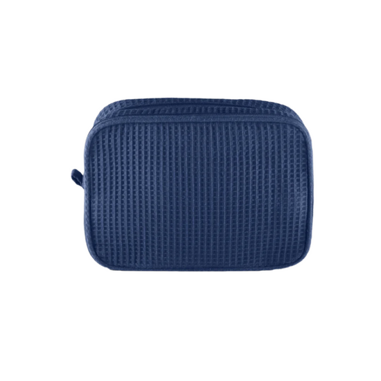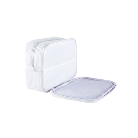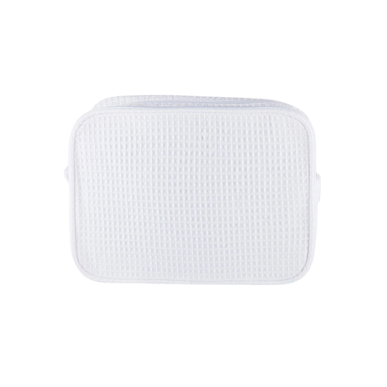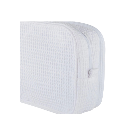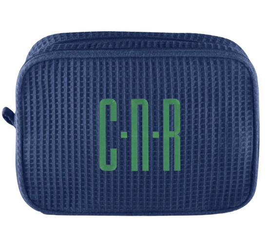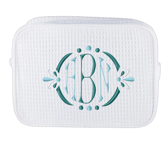 Great for traveling to keep all your belongings safe and secured with a water proof lining. The monogrammed cosmetic bag comes in gray or white. Product Details: 6.5 oz/square yard fabric face, 60% cotton & 40% polyester waffle weave, 100% oxford nylon water repellent lining. Please specify in notes white or gray bag. Monogram style and color as shown.